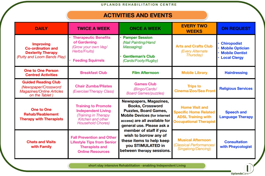 We at Uplands try our very best to introduce our residents to activities, which not only stimulates them but also are fun and impactful! Our specialist have devised a unique list of activities which lifts the mood of residents and staff alike! Exercise and Rehabilitation does not need to be boring and we take pride in making all our activities colourful!